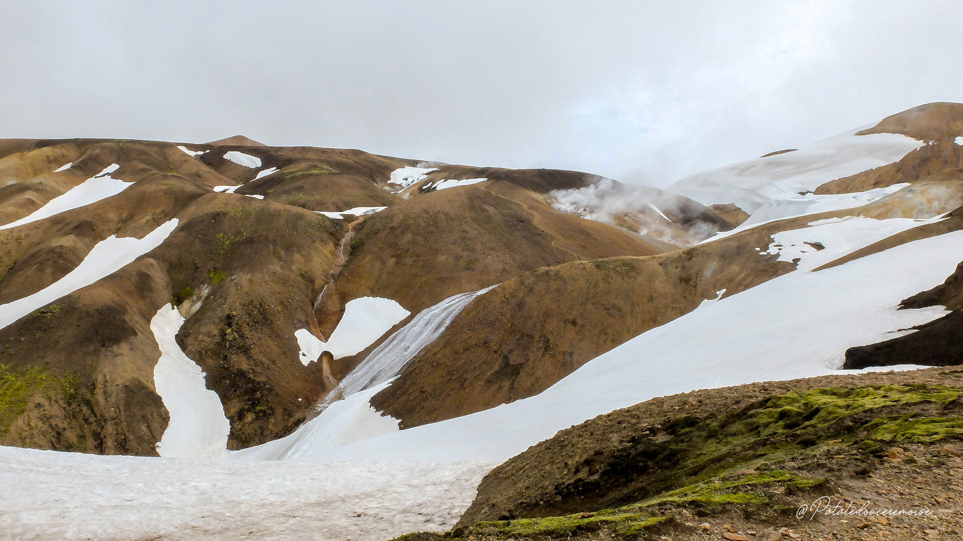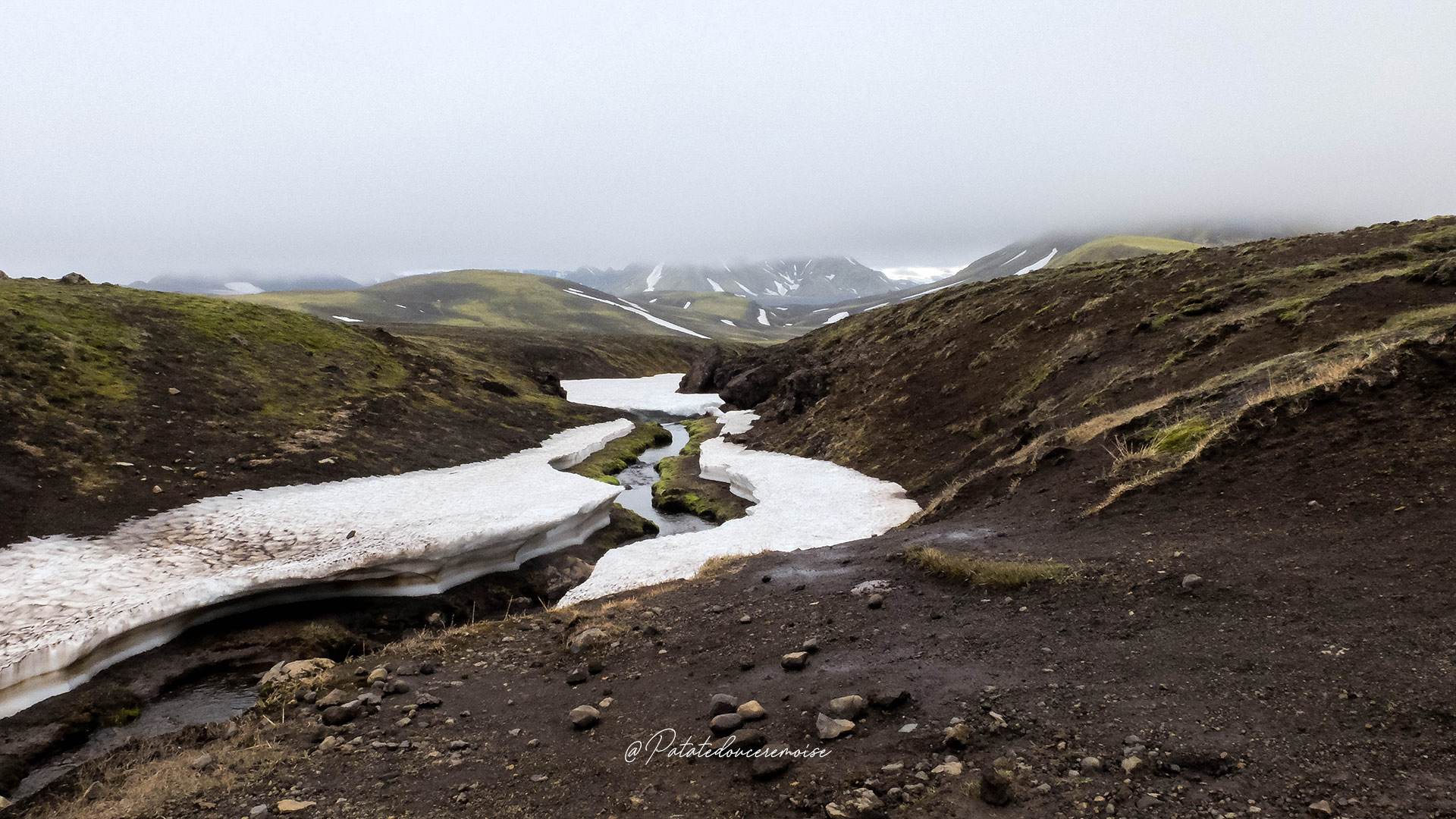 Nous repartons et marchons encore quelques kilomètres dans la neige. Le paysage est très beau, mais les couleurs des montagnes sont cachées par un épais manteau blanc, quel dommage ! Nous passons un dernier col et les montagnes du Landmannalaugar apparaissent, ENFIN!