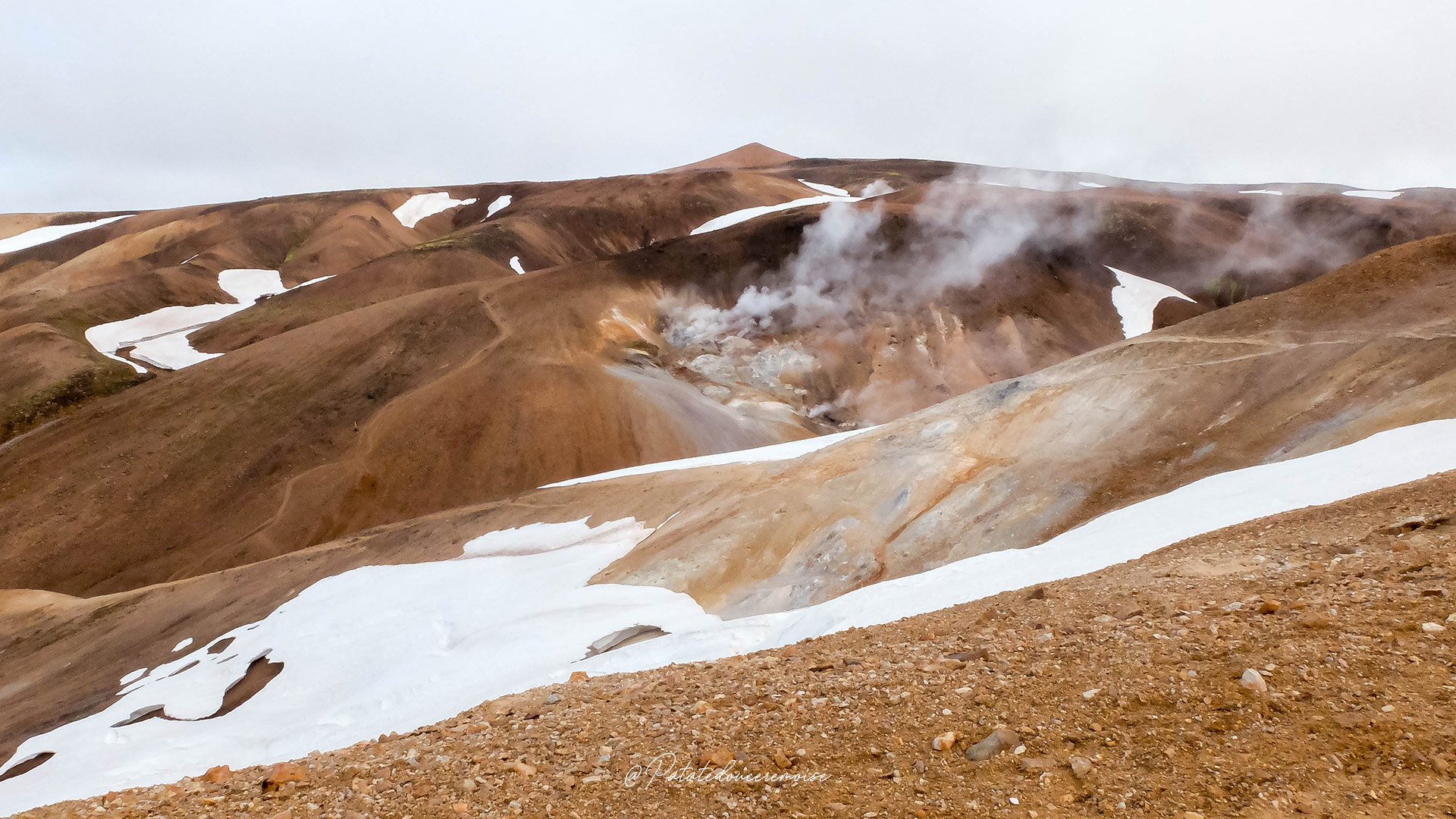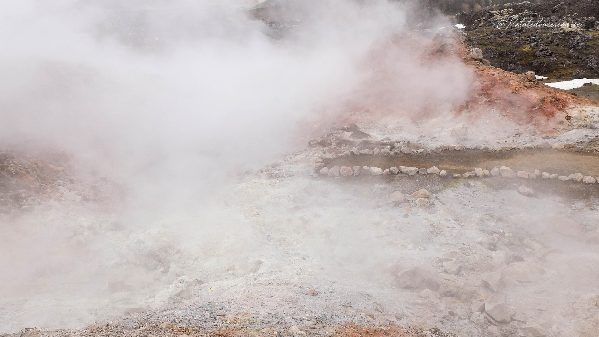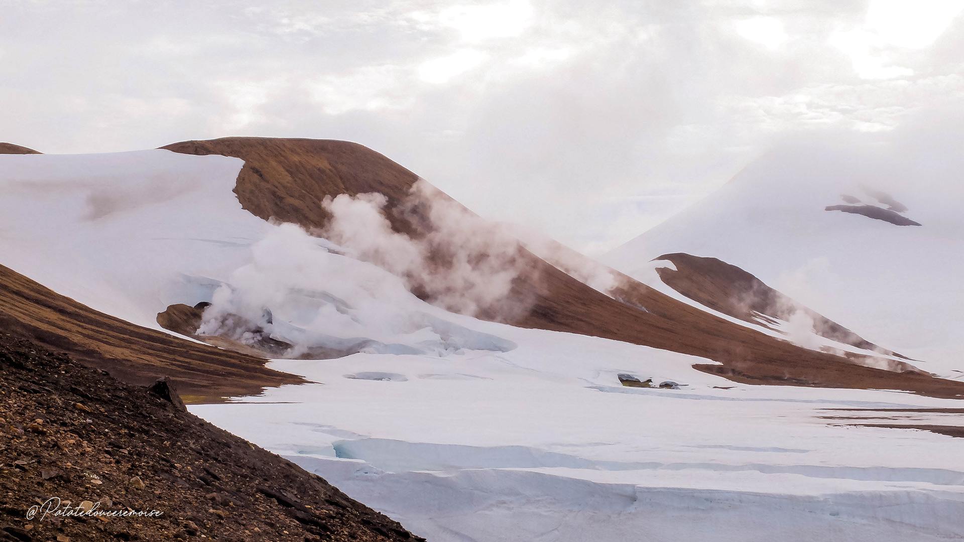 Arrivés au sommet, changement d’ambiance : les fumerolles se mêlent aux nuages et la terre se pare de ses plus belles couleurs. L’ambiance est mystique, presque surréaliste. L’Islande est vraiment un pays étonnant.