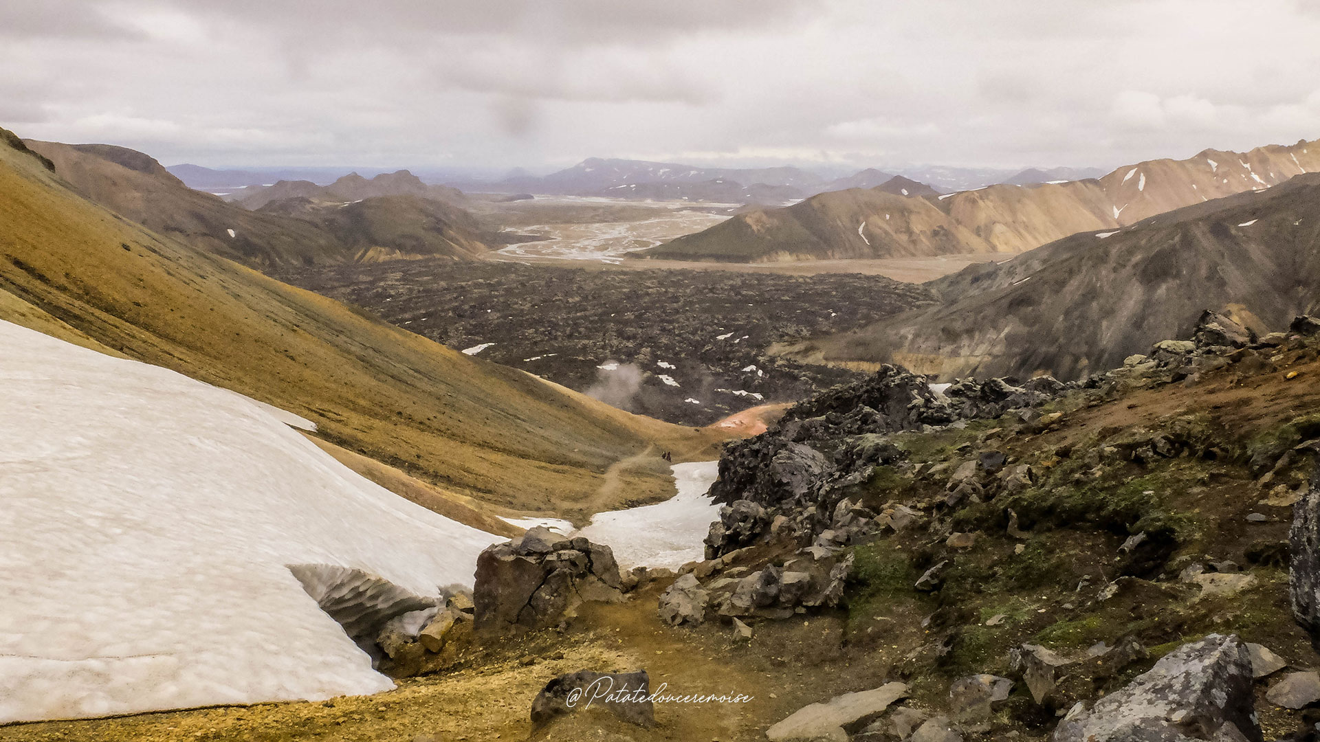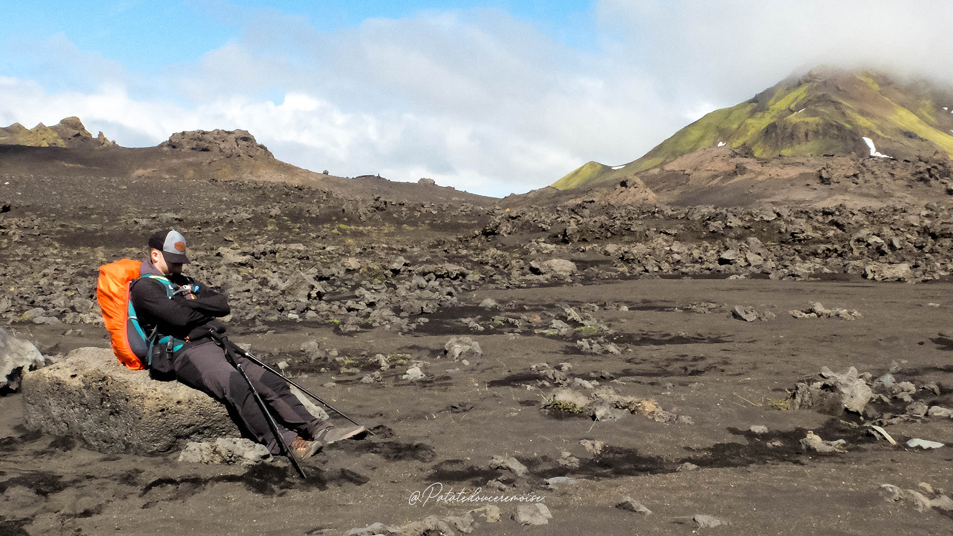 Une étape un petit peu plus courte que prévu: nous avions initialement pensé nous rendre directement à Álftavatn et terminer le trek en deux fois. Malheureusement, la gardienne du refuge de Botnar nous a appris que le refuge Hrafntinnusker était encore entouré par la neige et donc que les réservations étaient prises d’assaut. Il ne nous sera pas possible d’y dormir. Nous décidons de nous diriger vers Hvanngil, et le lendemain 5km plus loin, à Álftavatn. Cela nous permettra de nous reposer avant la dernière étape. Le dernier jour sera donc le plus éprouvant: 24km.