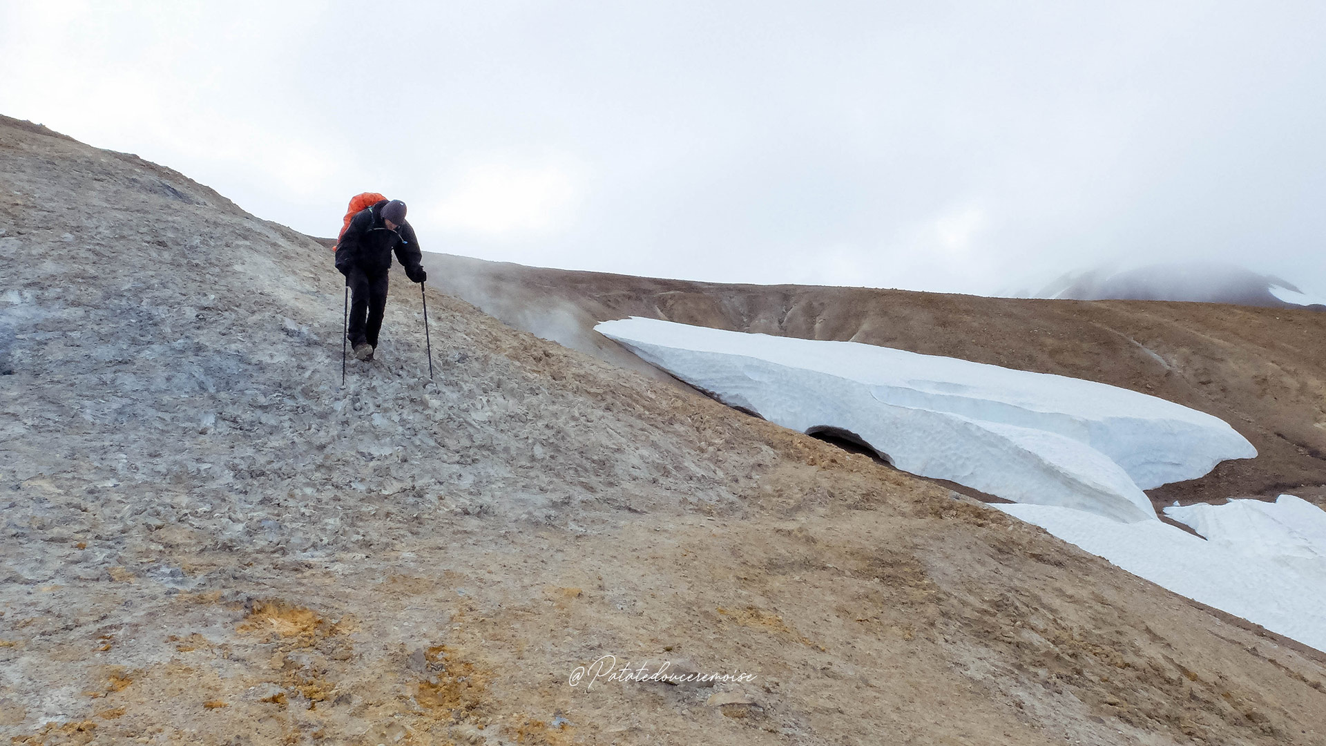 La présence de la neige nous ralentit un peu: les balises ne sont pas très visibles et nous dévions du chemin tracé. Nous approchons du refuge Hrafntinnusker. Le plateau sur lequel nous arrivons nous offre une vue magnifique sur ces montagnes colorées. Cependant, la couche de neige est de plus en plus épaisse et la dernière montée avant d’arriver au refuge semble interminable. Nous avons faim et nous sommes trempés (marche dans la neige oblige), il est temps de faire une pause.