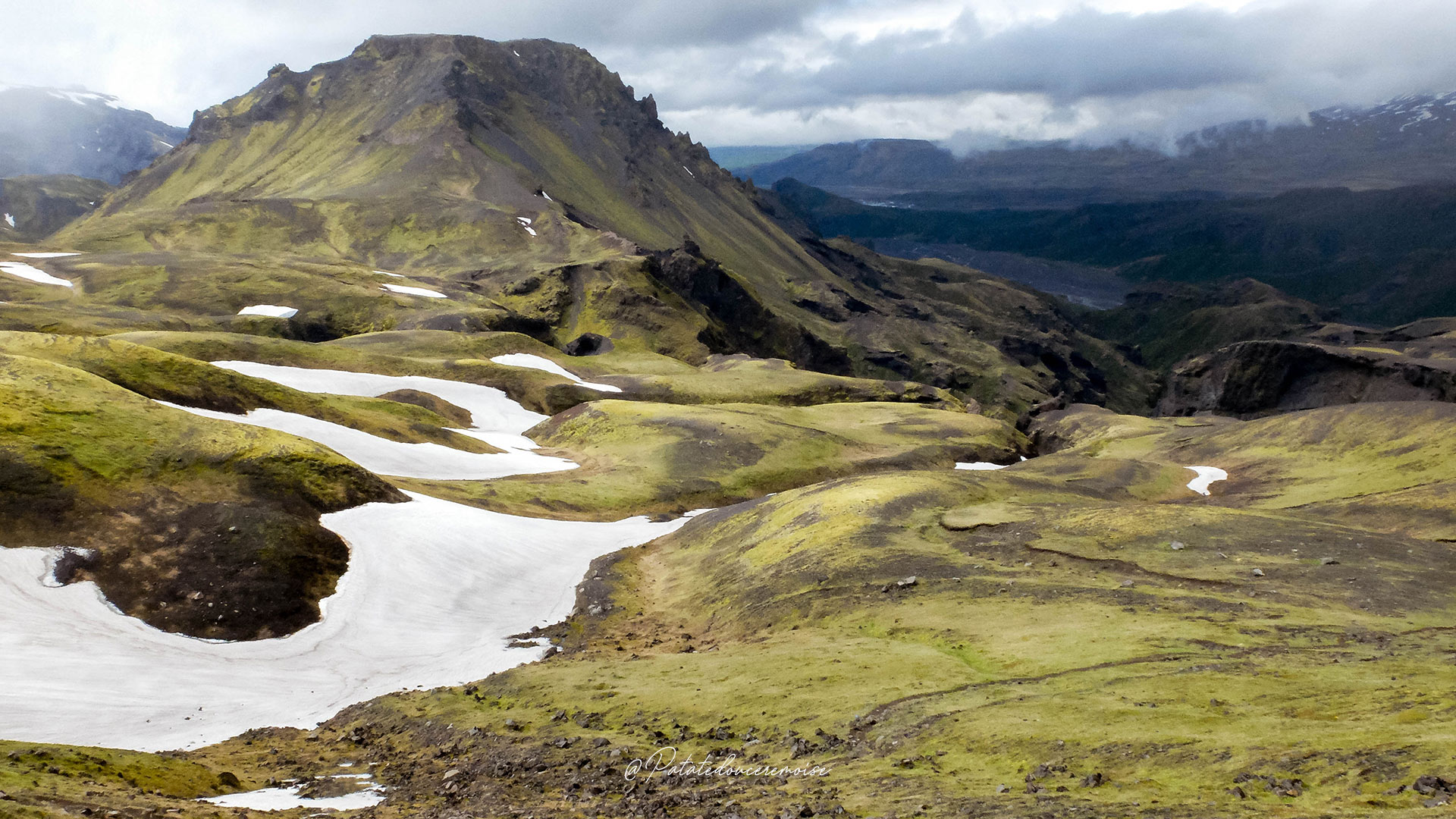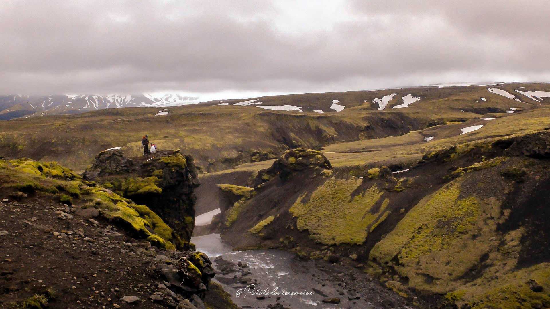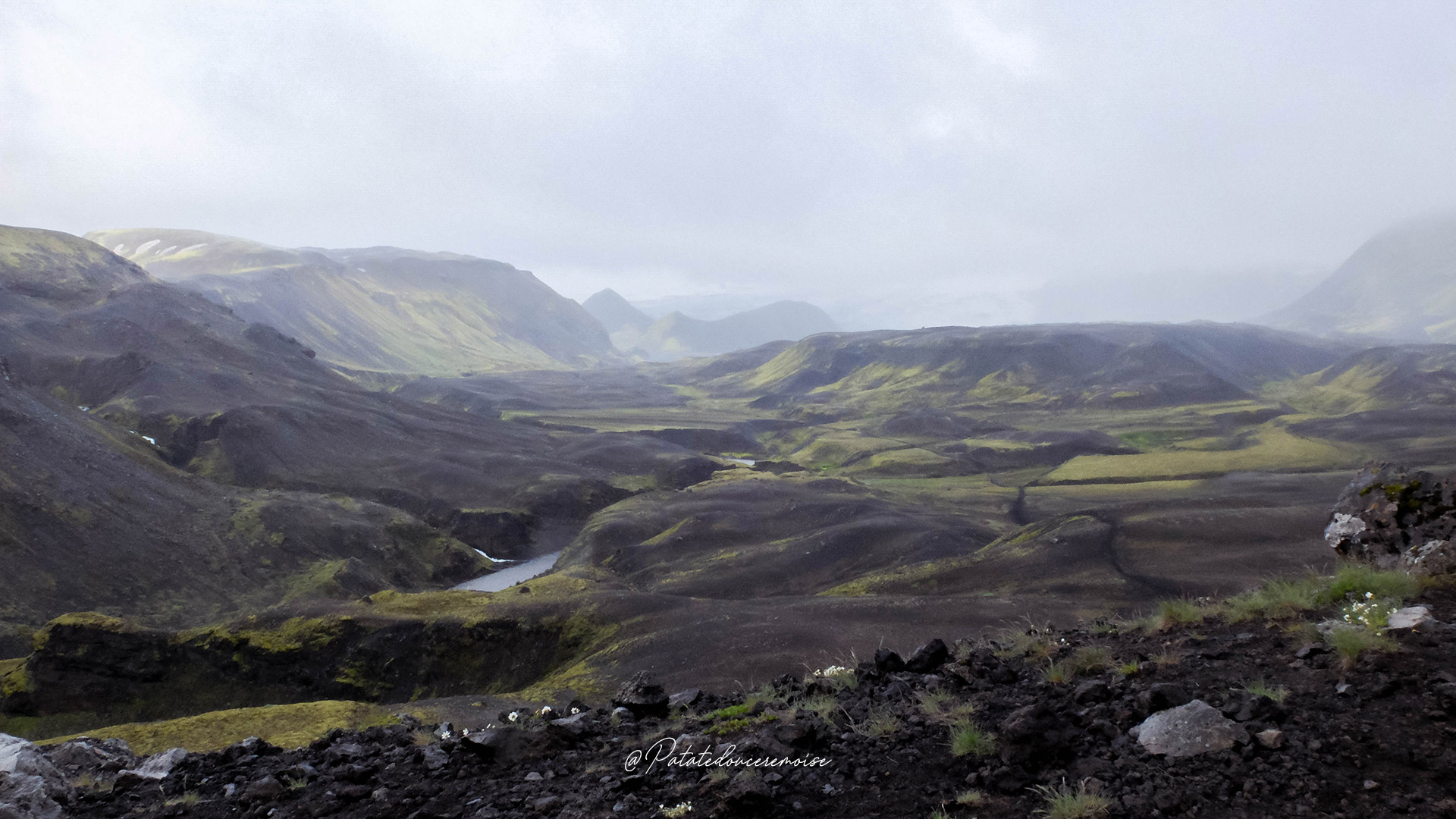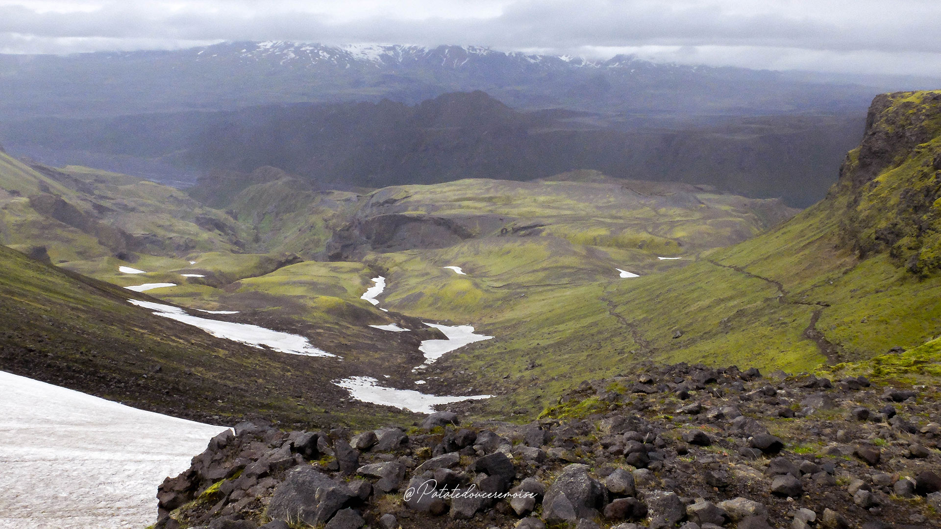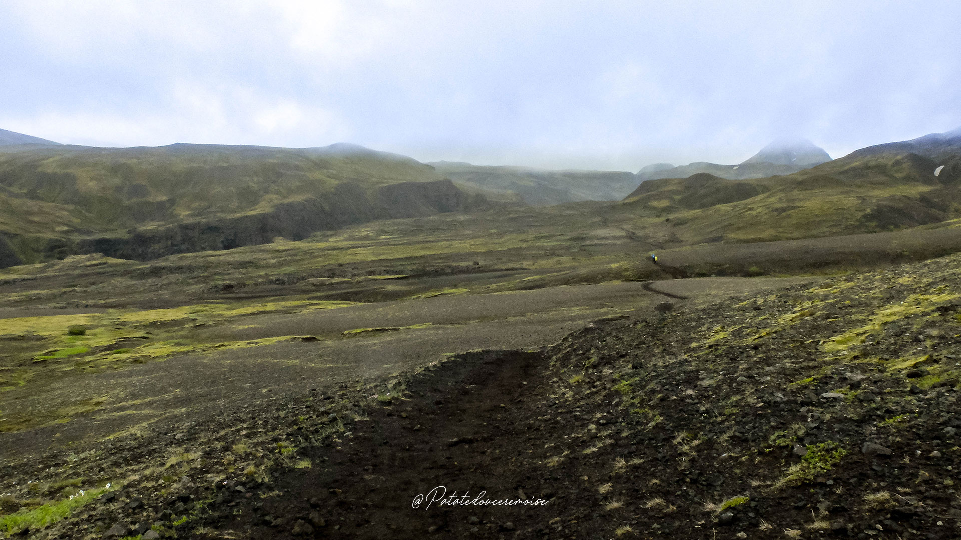 Nous suivons le chemin qui descend le long des flancs du volcan, franchissons un dernier plateau et enfin : la grisaille s’éloigne ! Elle nous laisse apercevoir la magnifique vallée de Þórsmörk. C’est décidé, la pause du midi se fera là, afin d’admirer un peu le décor et surtout le chemin parcouru.