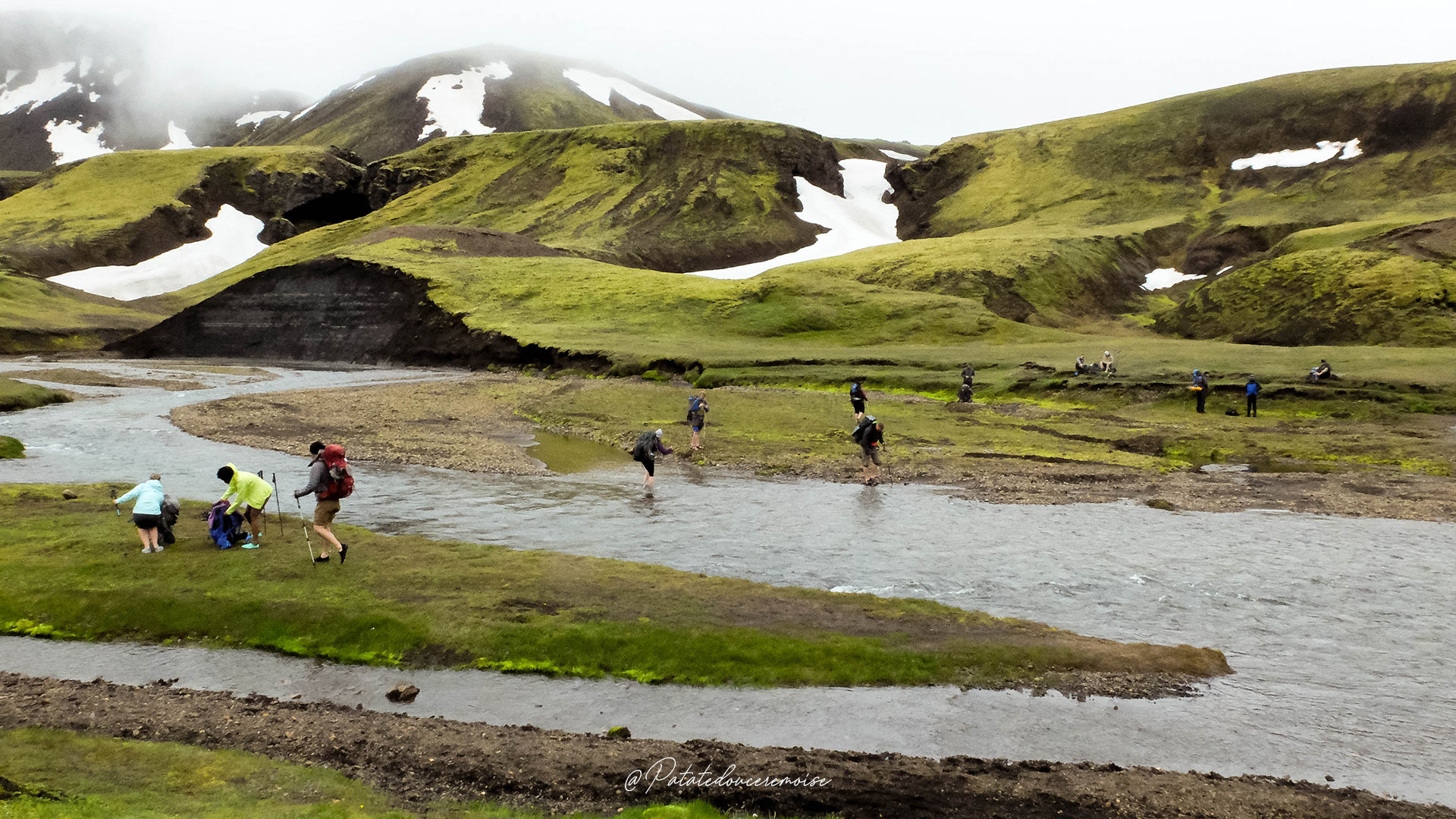 Nous traversons des petits vallons encore un peu enneigés et devons passer un nouveau gué. Tous les marcheurs du jour semblent se retrouver ici, attendant leur tour pour passer en essayant de trouver l’endroit le moins profond.