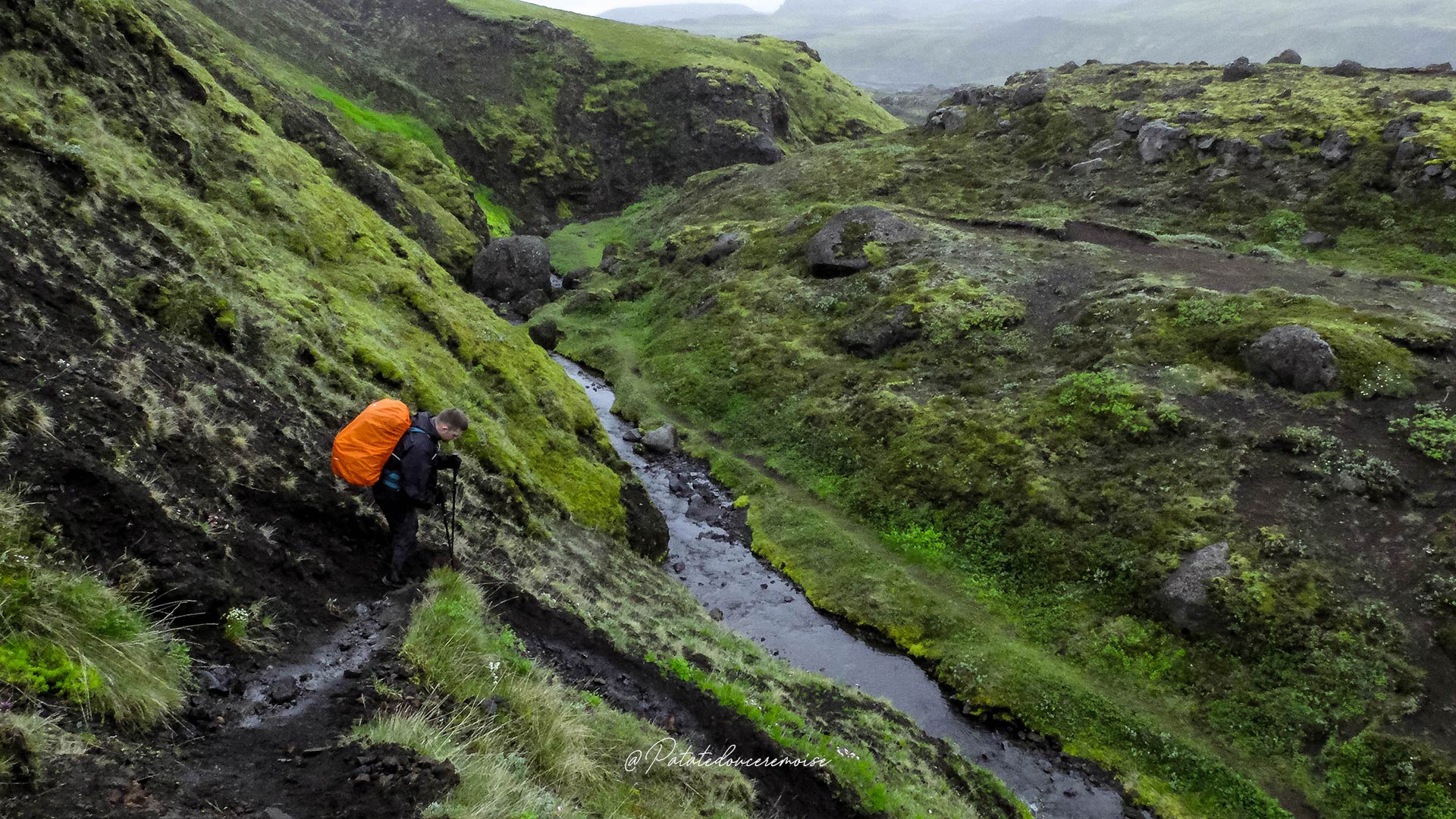 D’entrée de jeu, il faut escalader l’interminable chemin le long de la cascade : un bel avant goût de ce qui nous attendait pour le reste de la journée ! Les 6 premiers kilomètres nous longeons la rivière, le paysage est très vert (oui même au mois de Juin), les reliefs, improbables et la vue de plus en plus magique à mesure de l’ascension.