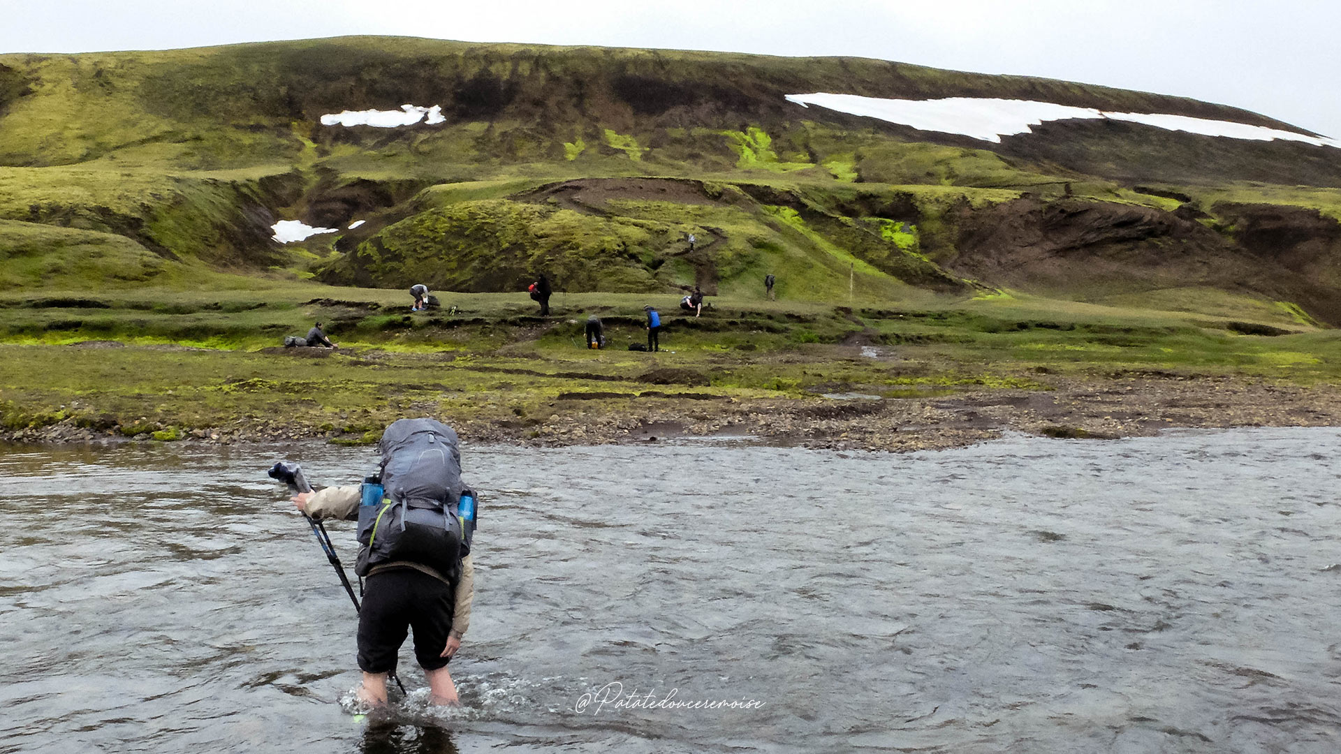 Cette fois-ci, nous avons traversé comme des pro: nous n’avons même pas sourcillé quand nos petits doigts de pieds ont touché l’eau! Nous sommes passés, tongs aux pieds, pantalon relevé et bagages bien protégés. C’était la fierté de la journée et la dernière étape avant d’arriver au refuge. Nous arrivons vers 11h30, ce qui nous laisse beaucoup de temps pour nous reposer. Le refuge d’Álftavatn dispose d’un petit restaurant mais il ne faut pas être difficile : plat unique ! Après 5 jours de repas déshydratés et de viande séchée, la soupe de légumes et le pain aux noix nous ont semblé être dignes d’un restaurant 3 étoiles. Il faut dire que pour l’équivalent de 40€, il fallait savourer.