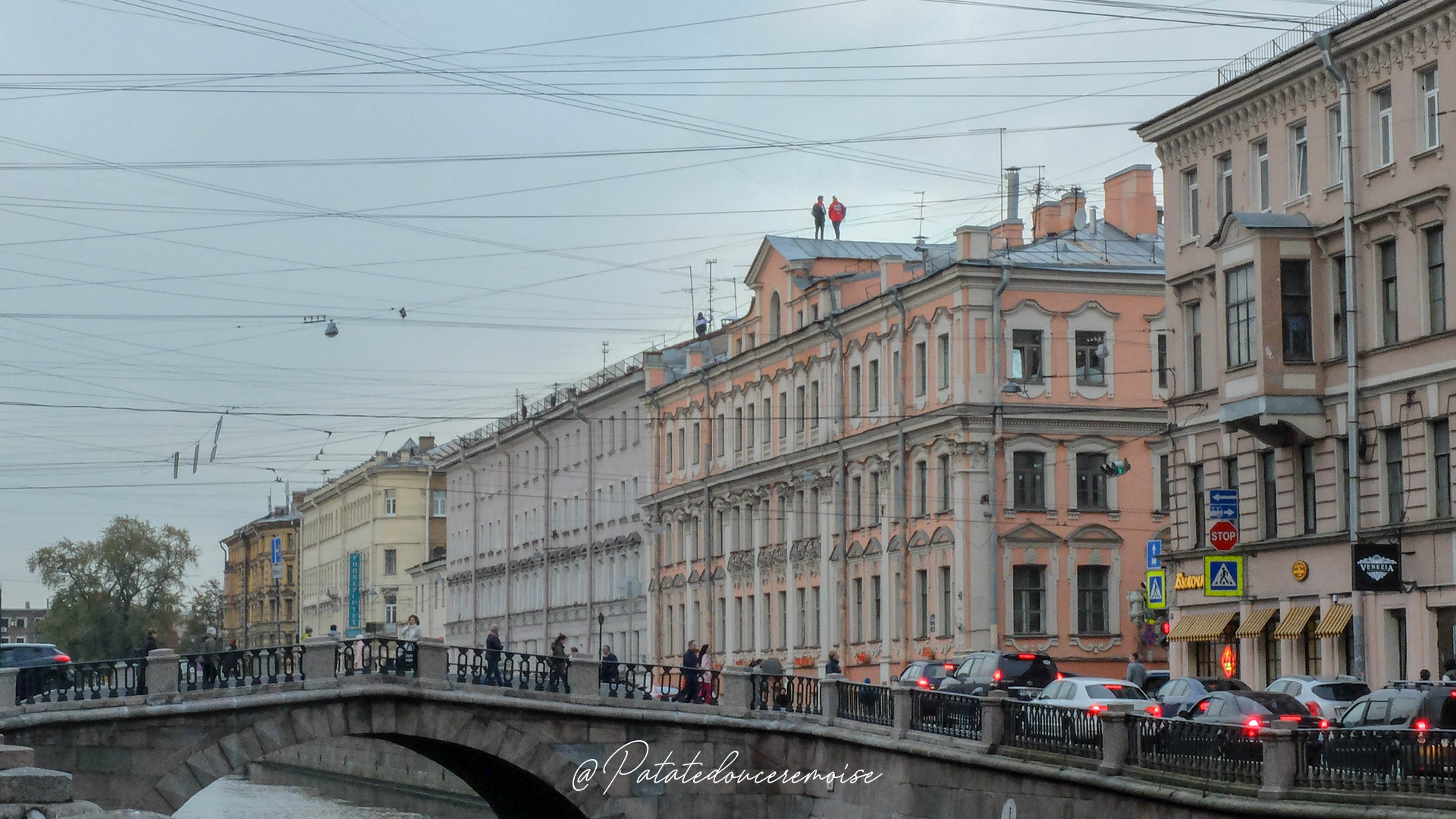 Des bords du canal on peut admirer les jolies façades petersbourgeoises, colorées, imposantes. En me promenant j’ai même pu apercevoir deux personnes qui, non contentes d’admirer Saint-Pétersbourg depuis le sol, ont choisi de se poser sur les toits (après tout pourquoi pas, ça devait être joli!)