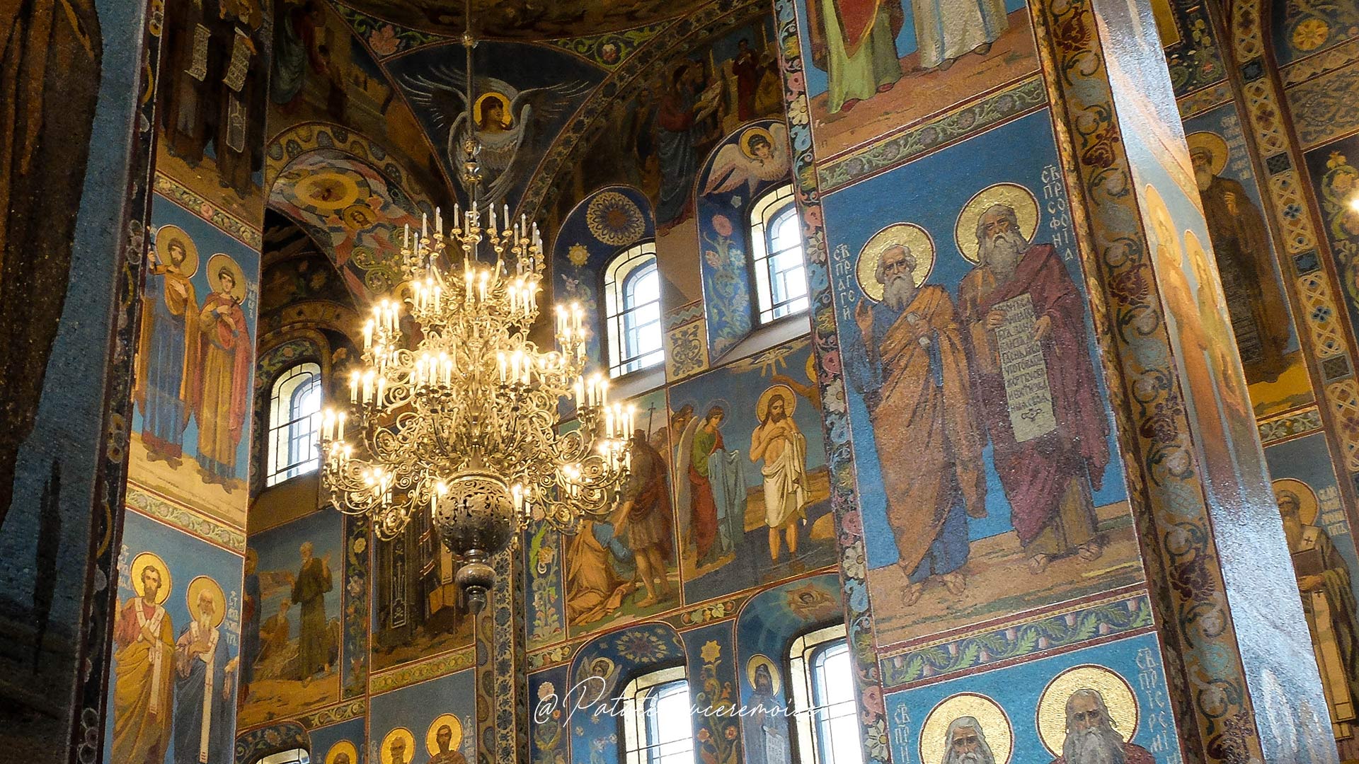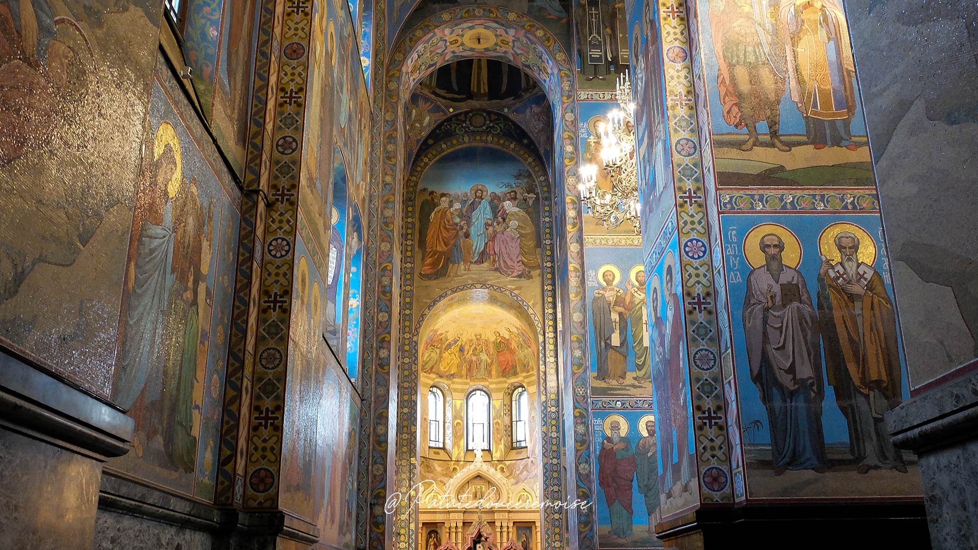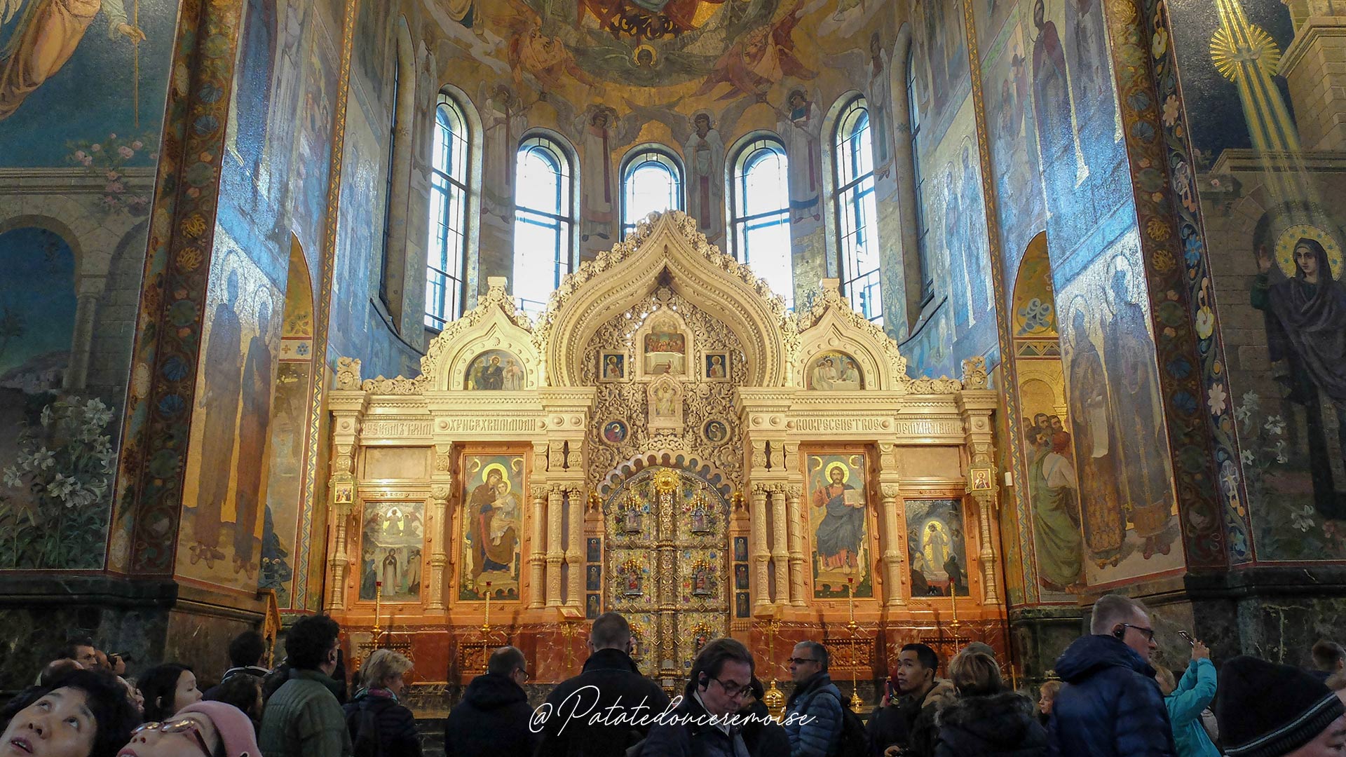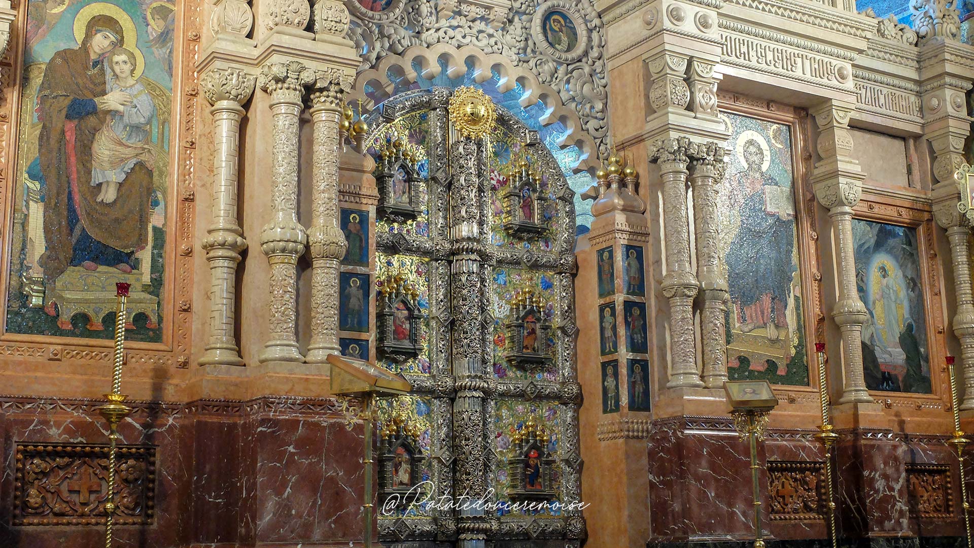 L’église Saint-Sauveur-sur-le-Sang-versé est une des seules que l’on peut photographier de l’intérieur. C’est bien dommage car les églises orthodoxes sont souvent magnifiques. Dans le cas présent, les murs sont recouverts de mosaïques, colorées et dorées, du sol au plafond. Le sol quant à lui est entièrement en marbre. Enfin, l’iconostase est impressionnante, elle aussi est intégralement sculptée dans le marbre.