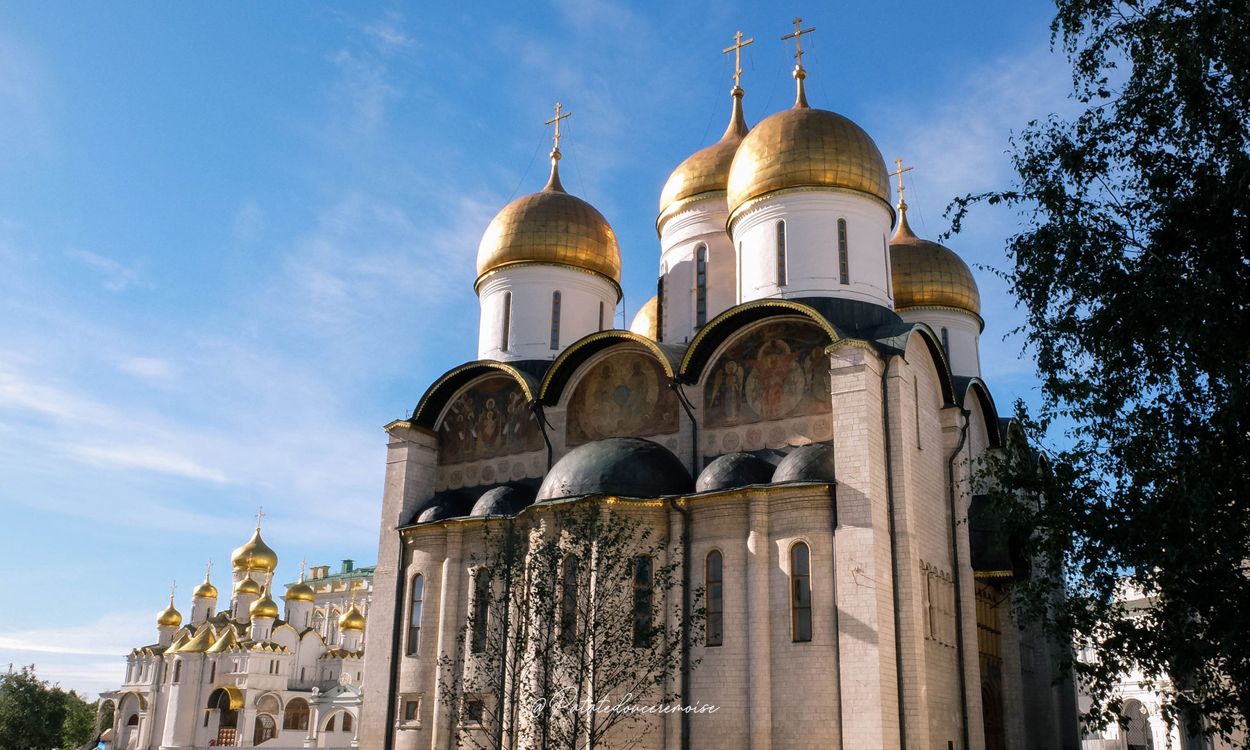 • La Cathédrale de l’Assomption est la plus somptueuse de toutes. D’imposants lustres descendent du plafond et l’iconostase fait plus de 16m de haut. C’était l’église officielle des tsars, elle est coiffée de dômes d’or.