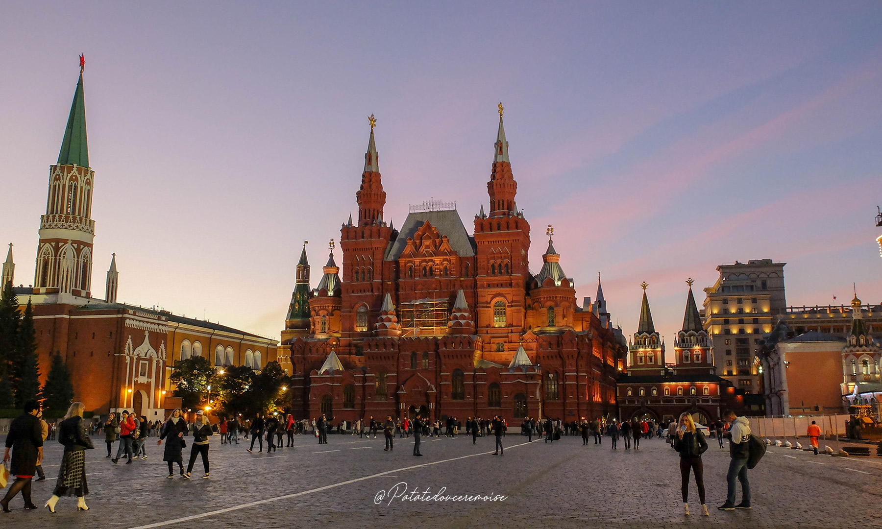 À la nuit tombée, tout s’illumine, l’ambiance est magique, romantique même. J’ai donc pris plaisir à me promener le long de cette place, m’asseoir et admirer. Ce lieu est très symbolique, c’est le centre de Moscou, celui qui a vu se dérouler tant de choses.