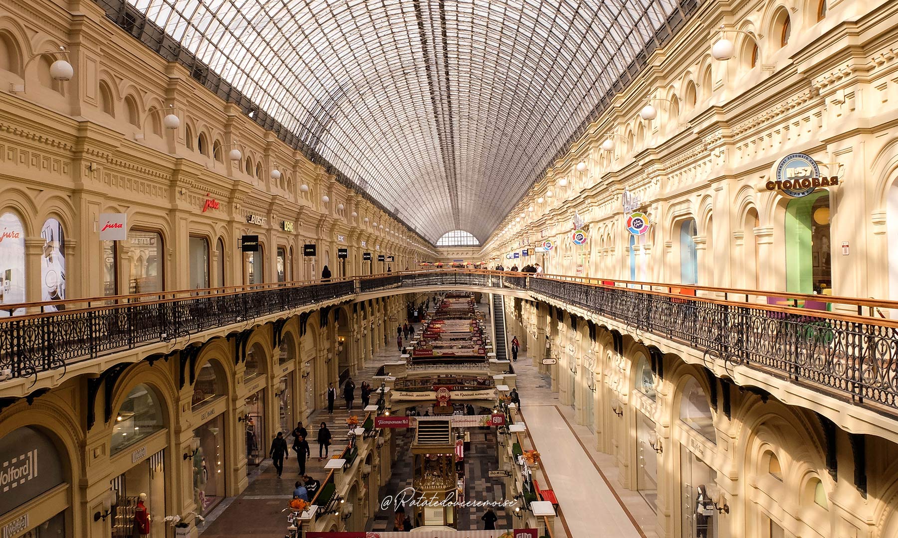 Le Goum (ГУМ) est un lieu incontournable sur la Place Rouge. Il occupe toute sa longueur et son architecture tranche vraiment avec le style de la place. Mais, si ce bâtiment est magique déjà de l’extérieur, il l’est encore plus à l’intérieur! Le Goum c’est un peu l’équivalent de nos Galeries Lafayette françaises. Les magasins de marques de luxes côtoient les épiceries fines et les restaurants.
