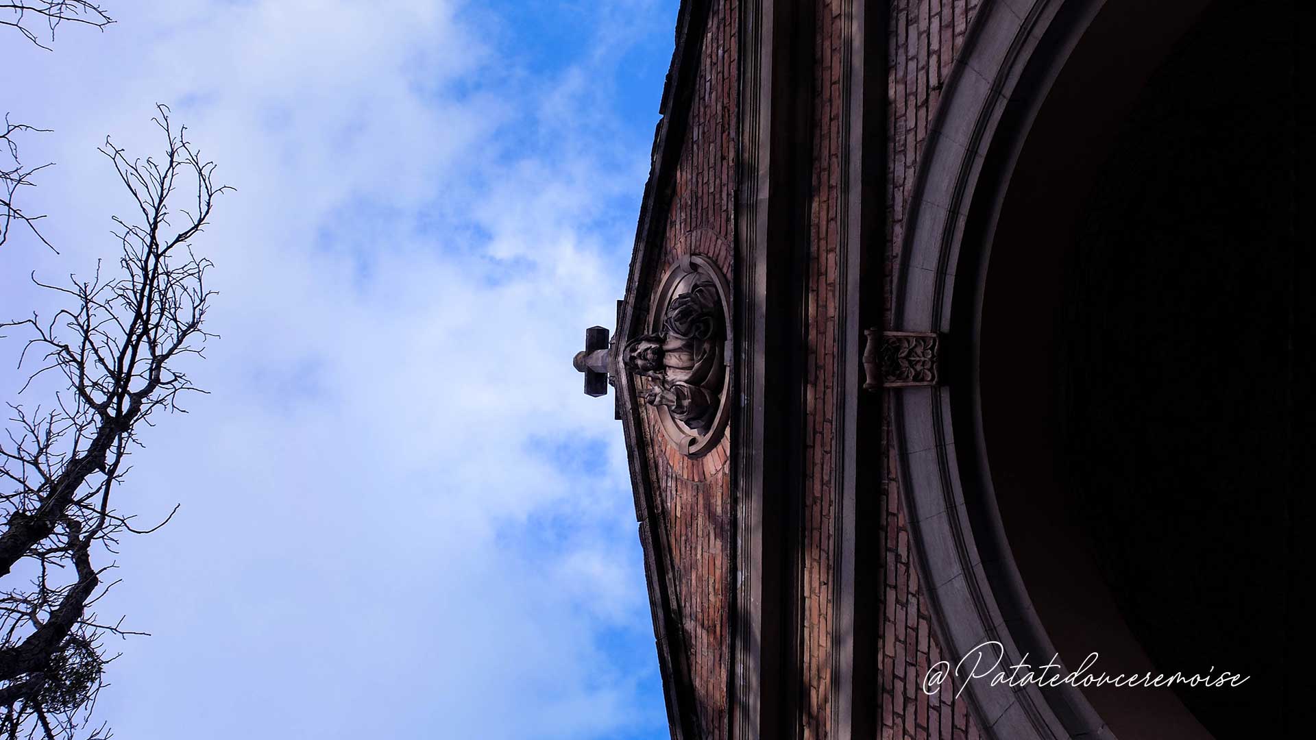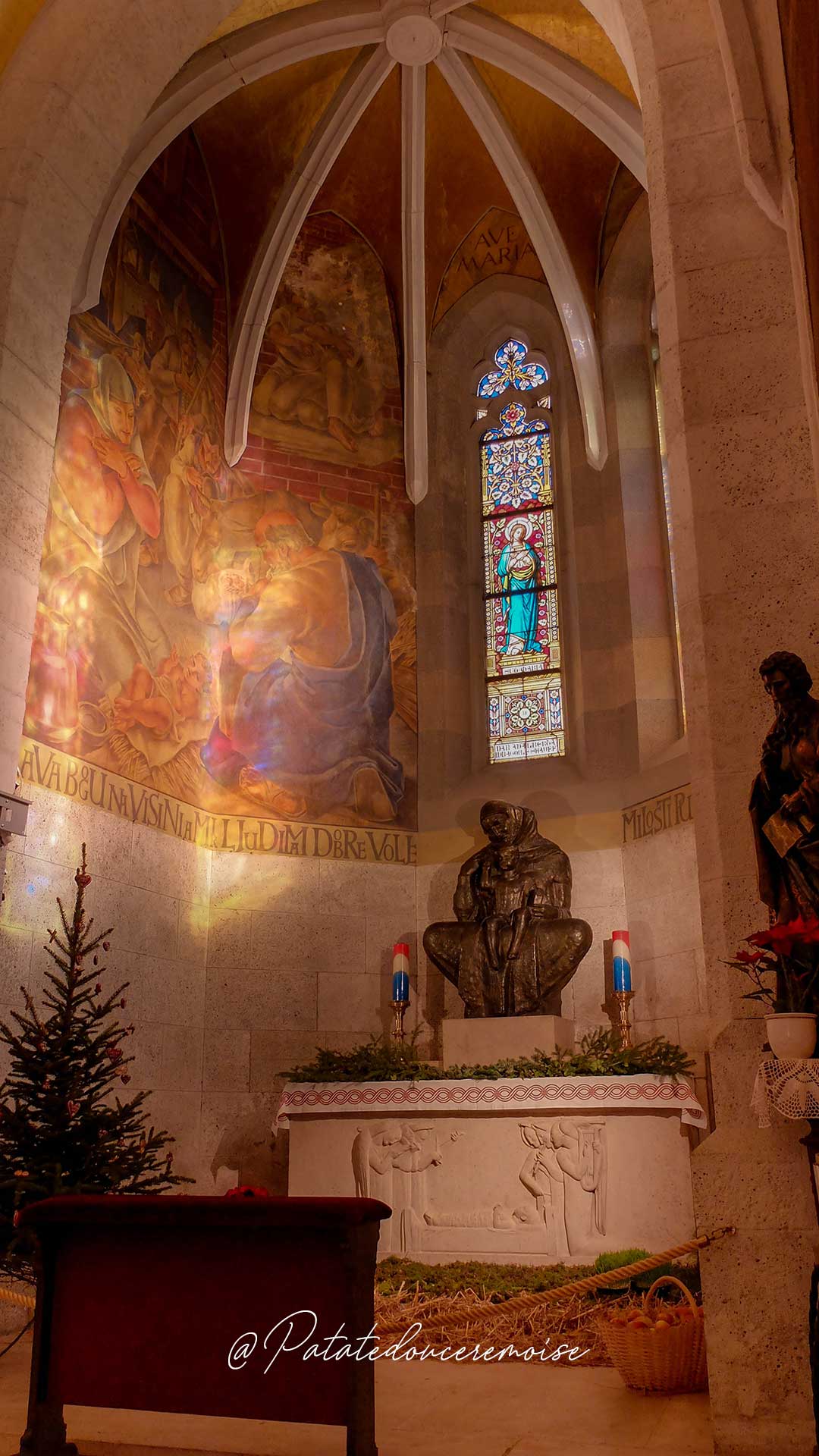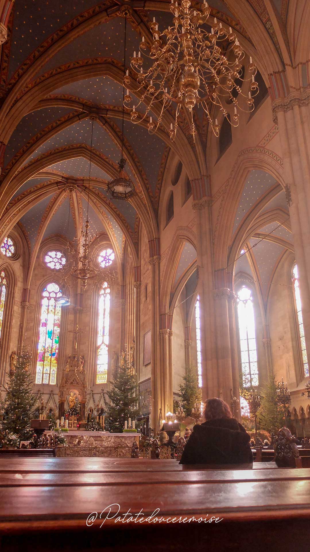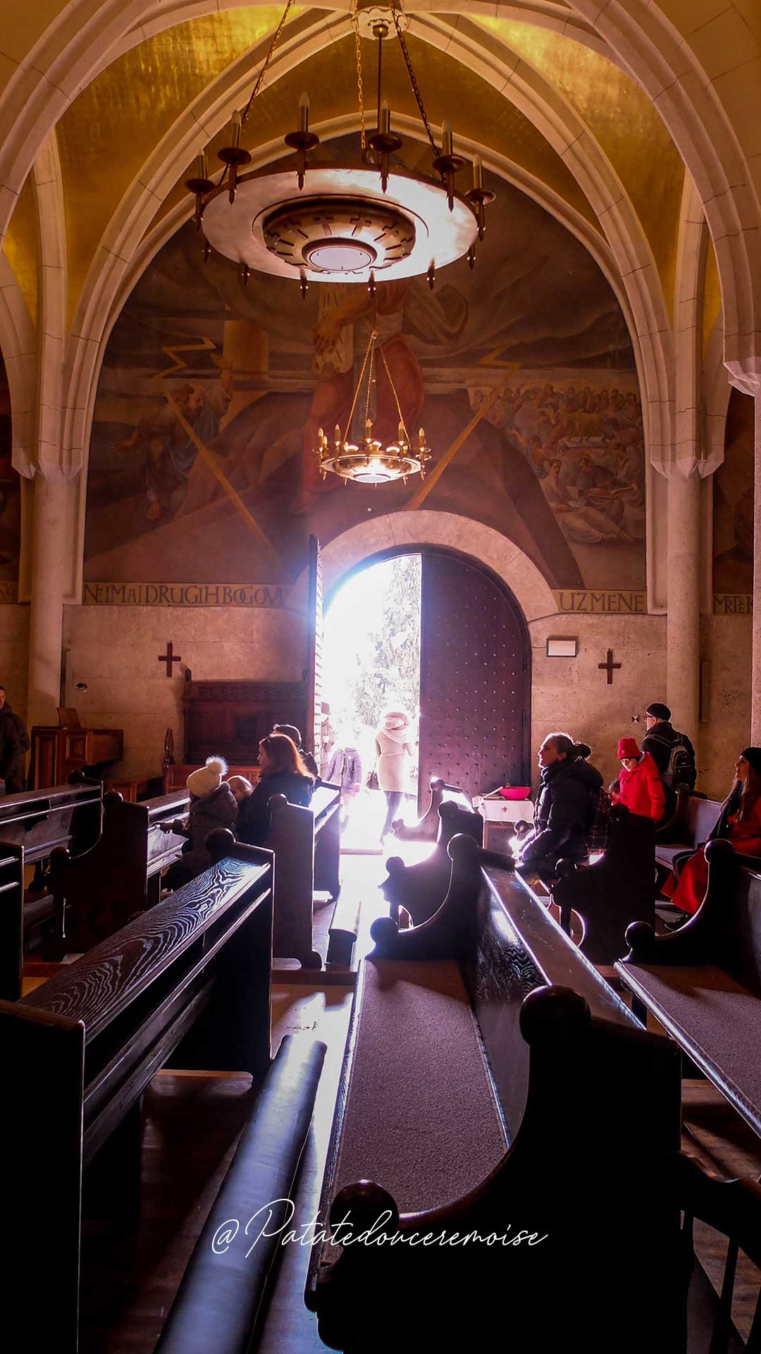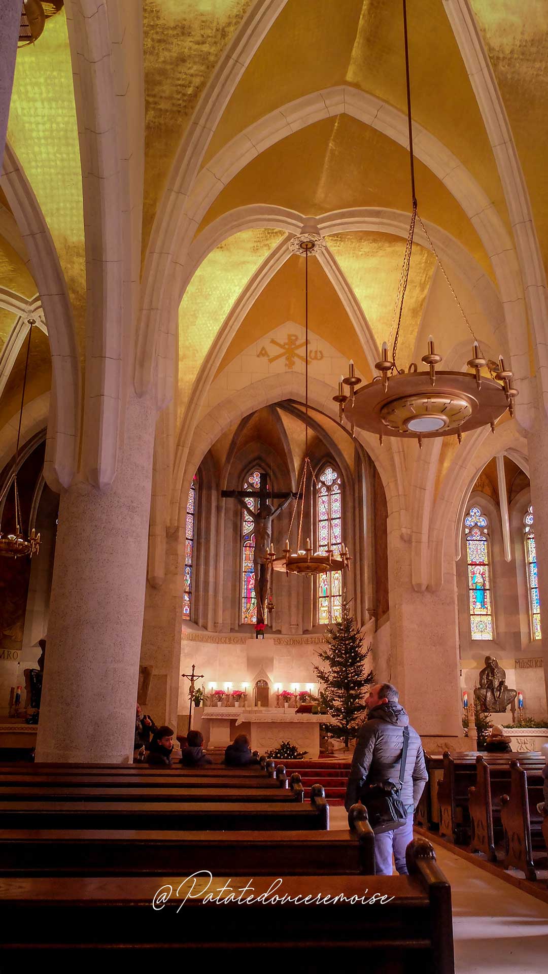 L’intérieur de l’église est beaucoup plus sobre que l’extérieur, c’est presque un peu décevant après tant de détails sur la façade! On notera tout de même le plafond doré orné de belles fresques sur lesquelles les couleurs des vitraux viennent s’inviter.
