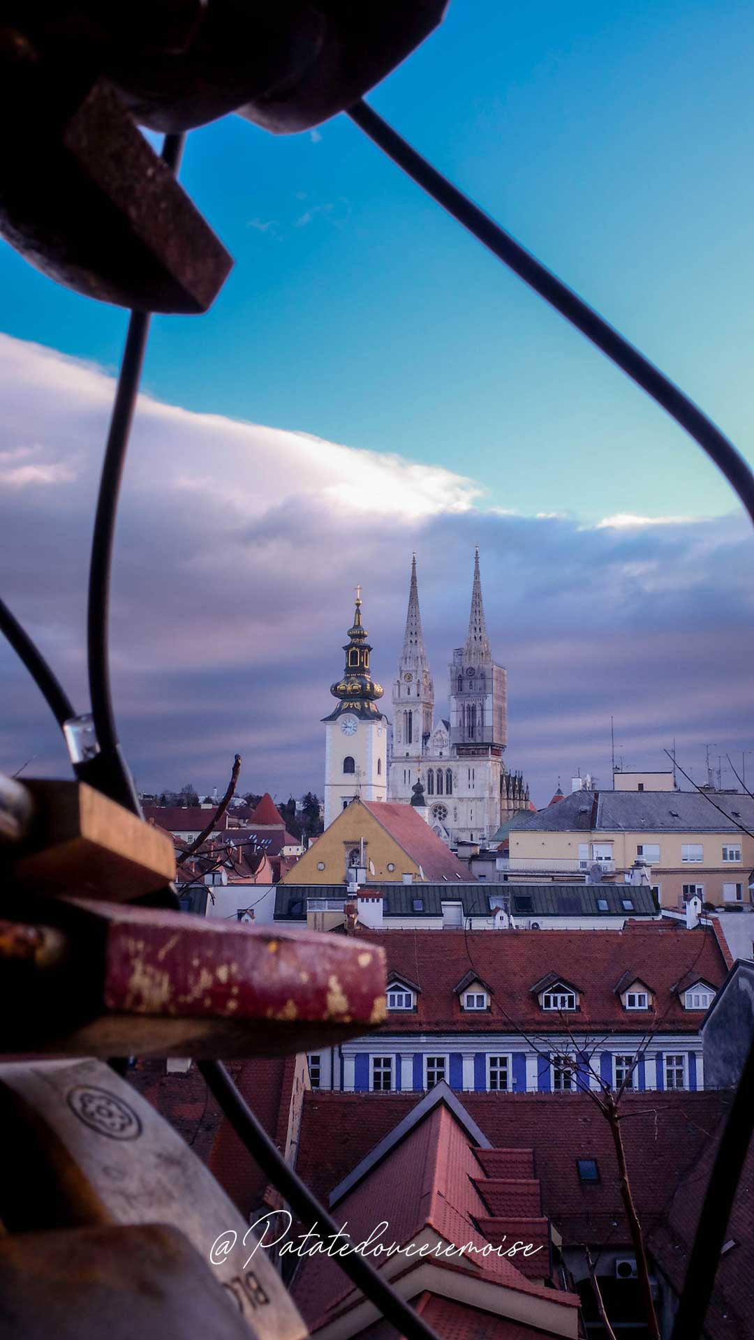 Il est possible de faire des arrêts aux différents étages pour avoir un aperçu de ce à quoi ressemblait la ville de Zagreb il y a quelques années. Au dernier étage, nous tombons nez à nez avec un canon, prêt à faire feu. On nous explique qu’un coup est tiré tous les jours à midi. C’est une tradition lointaine qui ne s’est interrompue que pendant les périodes de guerre. Le dernier escalier, bien plus étroit que les autres, nous amène à la passerelle et à sa vue imprenable. Nous avons de la chance, il fait tellement froid que peu de personnes s’y sont risquées, nous avons tout le temps d’admirer le panorama.